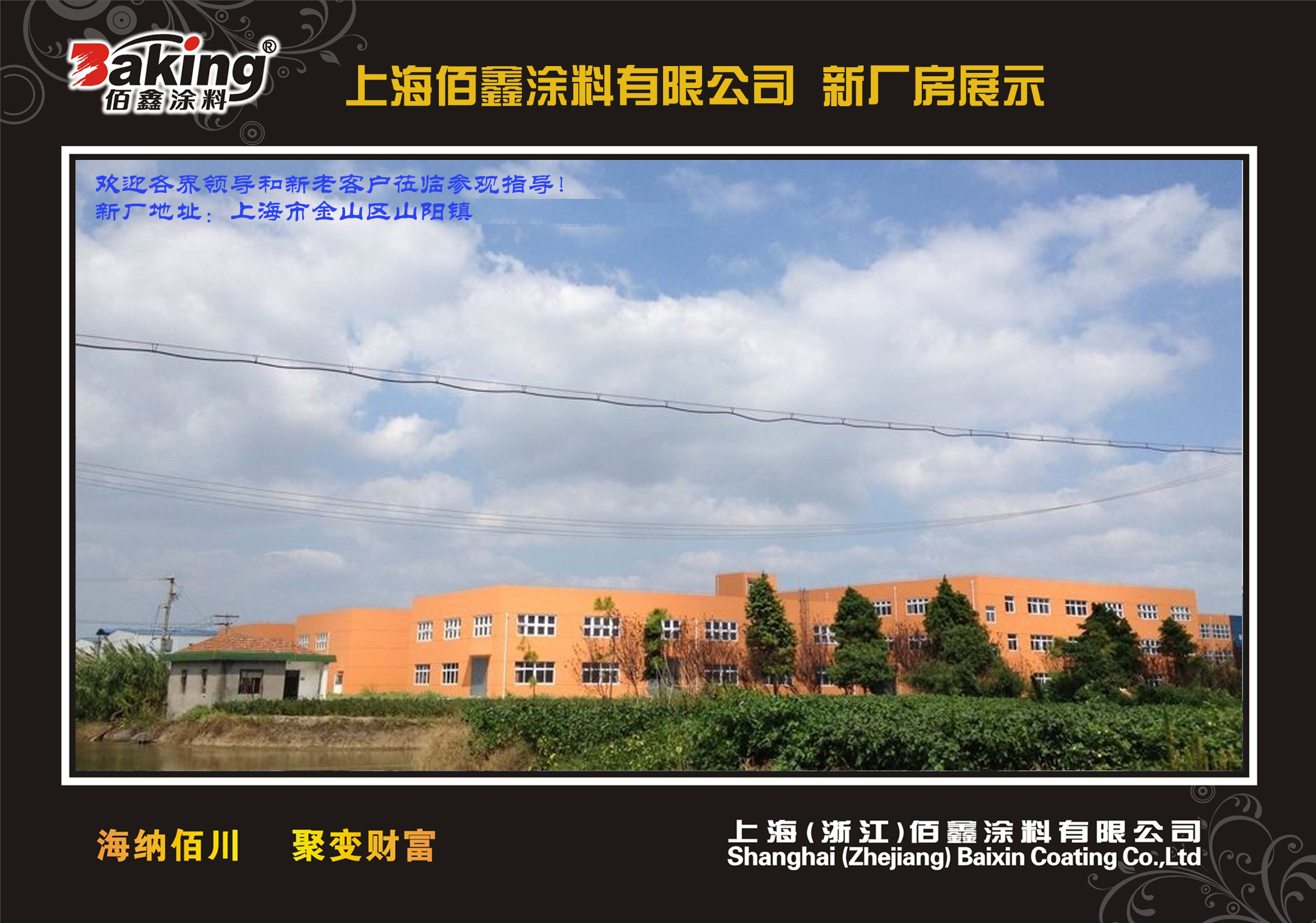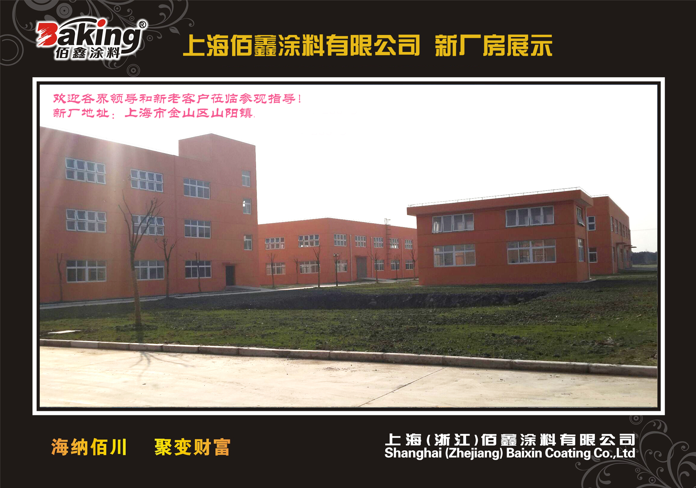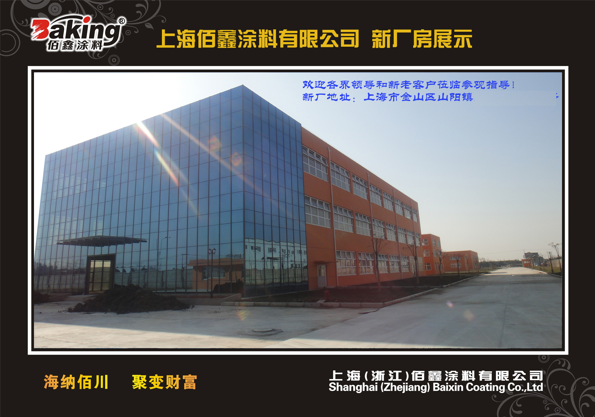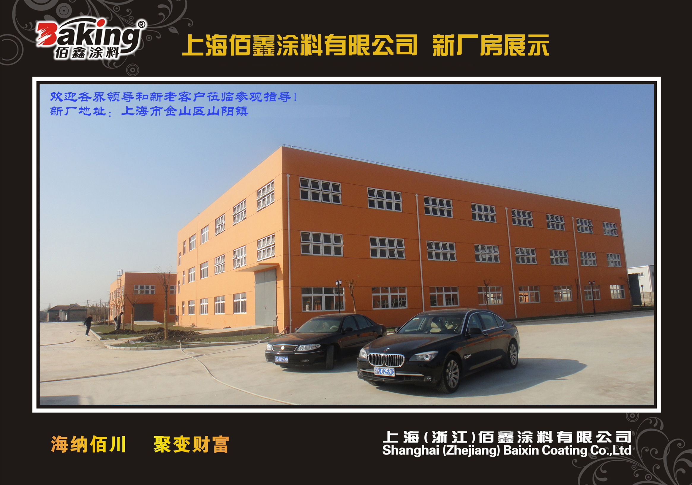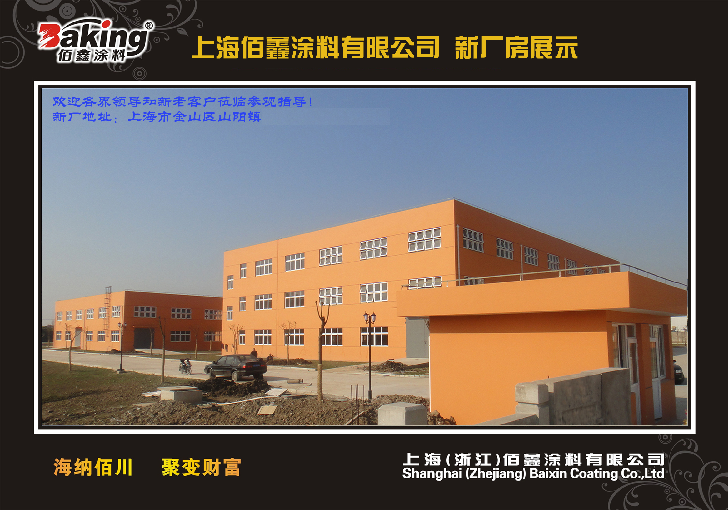 2008年在上海市金山化工区投资6600多万元建设完成上海佰鑫涂料有限公司的生产基地32000余平方米,年设计生产能力达15万吨,配有进口电脑配色系统及各种先进的检测仪器。先进的设备仪器,雄厚的技术力量,完善的生产销售管理,确保了佰鑫在建材行业的产品优势和市场满意度。公司致力于外墙涂料的产品研发、生产销售和客户服务,相继组建了上海、哈尔滨、合肥、济南、衢州、南宁、重庆、鄂尔多斯、大连、长春等十多家营销服务中心,产品远销中东迪拜、阿曼等国家。